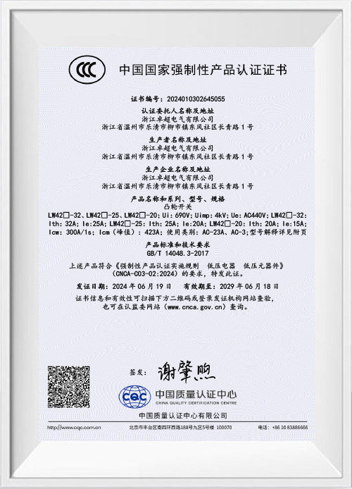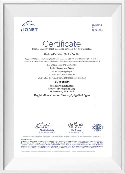 Zhejiang Zhuochao Electric Co., Ltd. wurde 2012 gegründet und ist auf die Herstellung und den Verkauf von Universal-Umschaltern, Kombinationsschaltern, Stromtrennschaltern, Lasttrennschaltern und Schweißmaschinenschaltern spezialisiert. Insbesondere die Umschalter des Unternehmens verfügen über führende technische Standards der Branche. Unsere Produkte verfügen über die Zertifizierung nach ISO9001:2008 für Qualitätsmanagementsysteme, die nationale 3C-Zertifizierung, die TÜV-Zertifizierung, die CE-Zertifizierung und die ROHS-Umweltzertifizierung und werden in strikter Übereinstimmung mit nationalen Standards hergestellt. Sie genießen eine starke Marktpräsenz in ganz China und werden in zahlreiche Länder und Regionen in Europa, Amerika und Südostasien exportiert. Darüber hinaus haben wir Kooperationspartnerschaften mit einer Reihe international renommierter Marken aufgebaut.