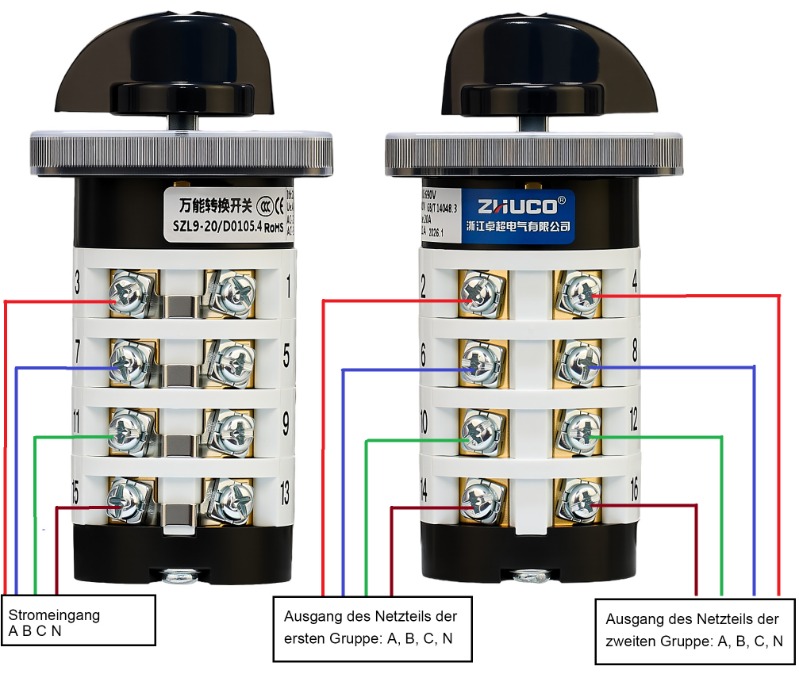 Der SZL9-20/D1050.4 ist ein vierteiliger Umschalter mit drei Positionen und einem Nennstrom von 20 A. Es verfügt über einen Leistungseingang, der in zwei Leistungsausgänge unterteilt ist, sodass zwischen zwei Geräten umgeschaltet werden kann. Wenn der Griff in Position 1 gedreht wird, wird der erste Satz ABCN-Kontakte verbunden; wenn er in Position 2 gedreht wird, wird der zweite Satz ABCN-Kontakte verbunden; und in der mittleren Position O werden alle Kontakte getrennt. Es eignet sich für Wechselstrom-Schaltkreise mit 50 Hz~60 Hz und einer Nennbetriebsspannung von ≤440 V und einer Bemessungsisolationsspannung von 690 V. Es verfügt über flammhemmende und hochtemperaturbeständige Materialien, gute Isolierung, Sicherheit und Haltbarkeit, Kontakte aus Silberlegierungen, verdickte Kupferkomponenten für stabile Leitfähigkeit und lange Lebensdauer, flexible Installationsmethoden, eine kompakte Struktur, ein klares Bediengefühl und einen anpassbaren Paneltext. Es kann angepasst werden, um eine einheitliche Schaltsteuerung für vier Schaltkreise oder durch verschiedene Positionskombinationen bereitzustellen, um verschiedene Betriebszustände zu erreichen und so die herkömmlichen Anforderungen der Mehrschaltkreissteuerung zu erfüllen.