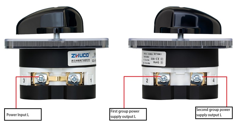 Funktion: Teilt einen Stromeingang in zwei Stromausgänge auf, um zwischen zwei Geräten zu wechseln. Wenn der Griff in Position 1 gedreht wird, wird die erste Gruppe L aktiviert; an Position 2 wird die zweite Gruppe L aktiviert; an der zentralen Position 0 werden alle Verbindungen stromlos gemacht.