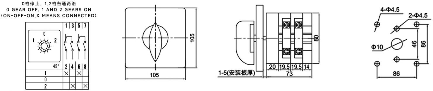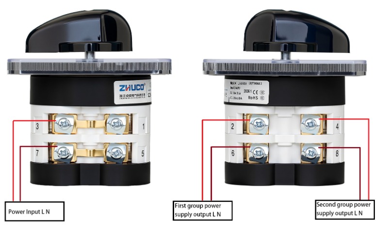 Funktion: Teilt einen Stromeingang in zwei Stromausgänge auf, um zwischen zwei Geräten zu wechseln. Wenn der Griff in Position 1 gedreht wird, wird der erste LN-Schaltkreis aktiviert; in Position 2 wird der zweite LN-Schaltkreis aktiviert; in der zentralen 0-Position werden alle Schaltkreise stromlos gemacht.