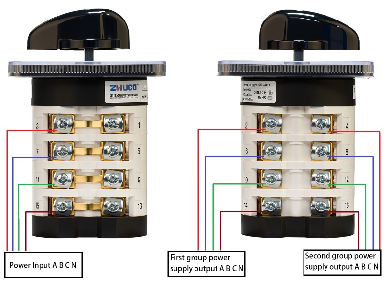 Funktion: Teilt einen Stromeingang in zwei Stromausgänge auf, um zwischen zwei Geräten zu wechseln. Wenn der Griff in Position 1 gedreht wird, wird die erste Gruppe ABCN aktiviert; an Position 2 wird die zweite Gruppe ABCN aktiviert; an der zentralen Position 0 werden alle Verbindungen stromlos gemacht.