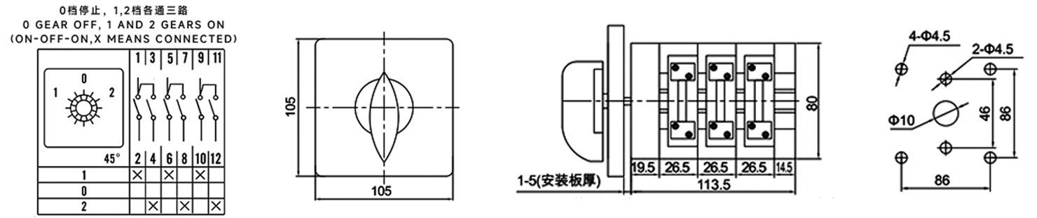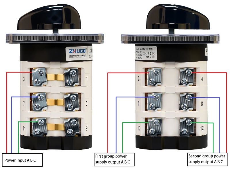 Funktion: Teilt einen Stromeingang in zwei Stromausgänge auf, um zwischen zwei Geräten zu wechseln. Wenn der Griff in Position 1 gedreht wird, wird der erste Satz ABC-Verbindungen aktiviert; an Position 2 wird der zweite Satz ABC-Verbindungen aktiviert; an der zentralen Position 0 werden alle Verbindungen stromlos gemacht.