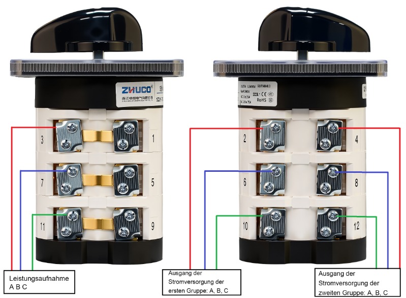 Der SZL9-75/D0723.3 hat einen Nennstrom von 75 A und verfügt über eine dreipolige Dreistellungsstruktur. Es hat einen Nennstrom von 75 A, wobei ein Stromeingang in zwei Stromausgänge aufgeteilt ist, um zwei Geräte zu versorgen. Wenn der Griff in Position 1 gedreht wird, wird der erste Satz ABC-Kontakte angeschlossen; wenn er in Position 2 gedreht wird, wird der zweite Satz ABC-Kontakte angeschlossen; und in der mittleren Position 0 werden alle Kontakte getrennt. Durch verschiedene Kontaktkombinationen können unterschiedliche Betriebsarten erreicht werden. Das Produktdesign legt Wert auf Betriebsstabilität und Praktikabilität und eignet sich daher für den Einsatz in herkömmlichen elektrischen Umgebungen.