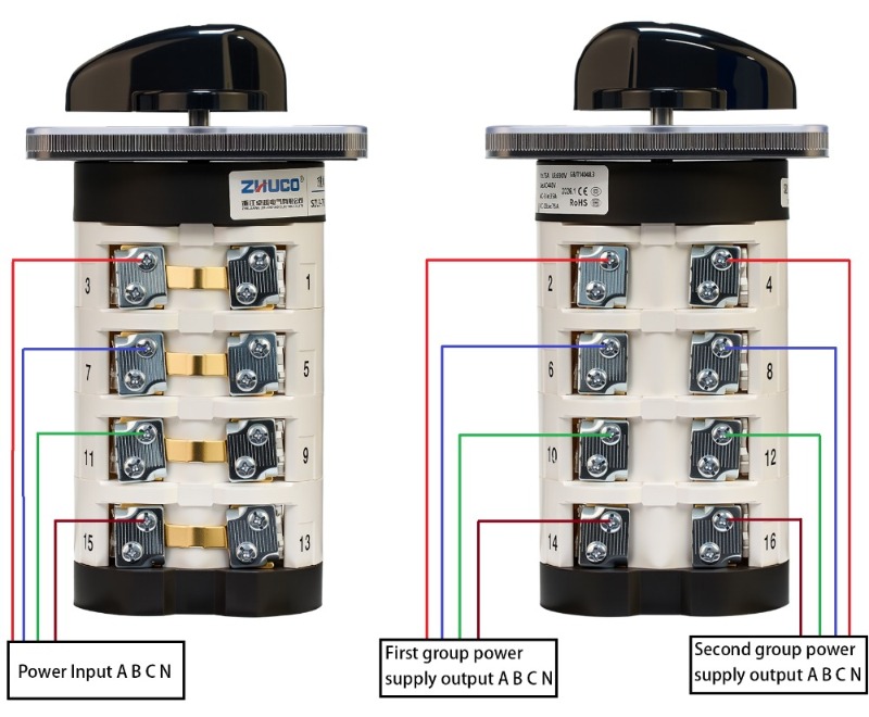 Funktion: Teilt einen Stromeingang in zwei Stromausgänge auf, um zwischen zwei Geräten zu wechseln. Wenn der Griff in Position 1 gedreht wird, wird die erste Gruppe ABCN aktiviert; an Position 2 wird die zweite Gruppe ABCN aktiviert; an der zentralen O-Position werden alle Verbindungen stromlos gemacht.